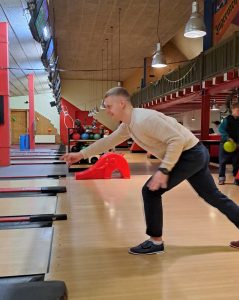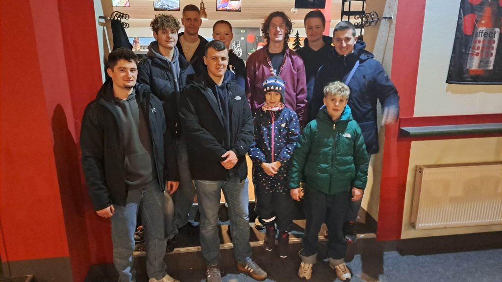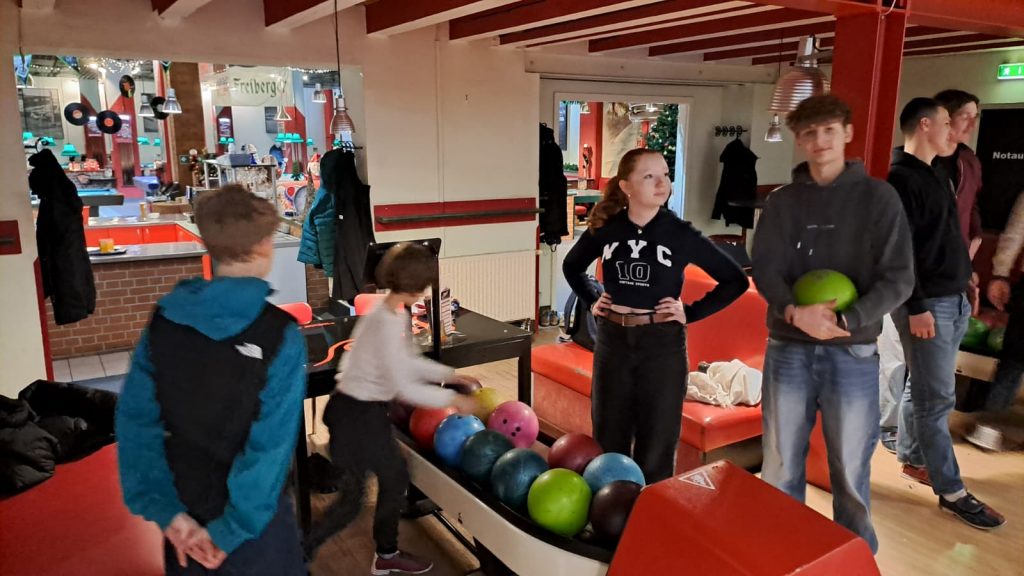 Neben verschiedenen Spielvarianten wie Billard, Dart und Mini-Golf hatten wir uns für Bowling entschieden. Bowling ist eine Variante des Kegelns, bei dem eine mit Bohrungen für die Finger versehene Kugel, auf eine Formation von zehn Kegeln geschoben wird. Die Jugendlichen suchten sich passende Schuhe aus und bereiteten sich auf das Kugelschieben vor.